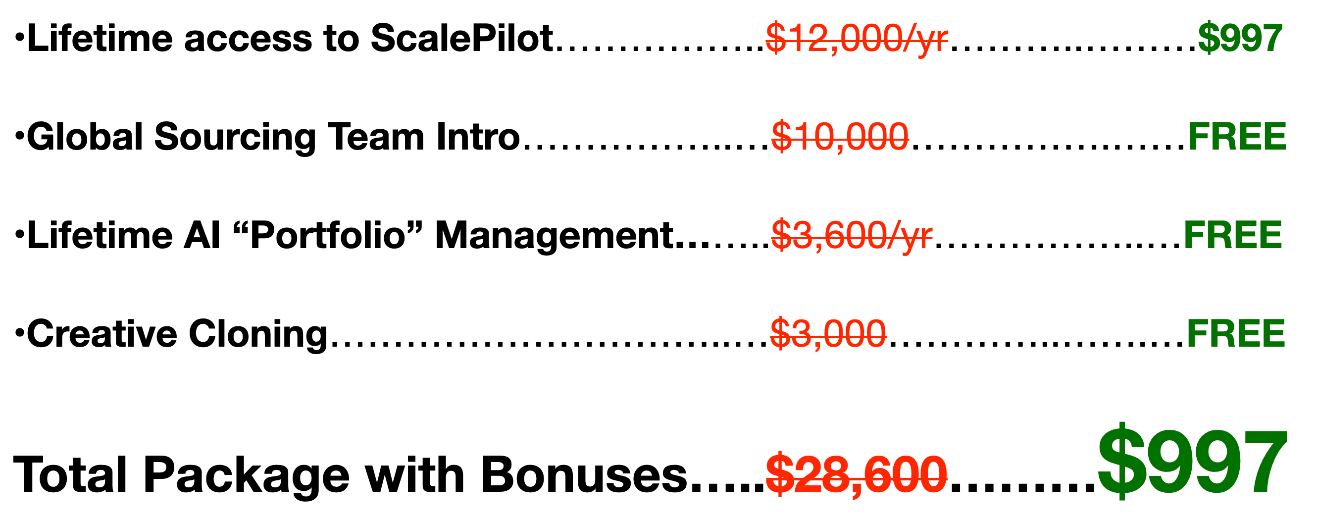ONE TIME OFFER: After selling dozens of Amazon brands we have created an entire system for getting the most out of your Amazon business when you sell. If you want to build a company that buyers fight over without any extra effort, then this is for you. Right now you can add Exit Max to your order when you join ScalePilot for only $197. This could literally put millions of dollars in your bank account by avoiding all of the mistakes we have made when selling companies. You will NOT have access to this later so grab it now. It’s the shortcut to maximizing the amount of money you put in your pocket. It’s all of our business broker introductions, negotiating strategies, and everything we have learned to max out your exit!